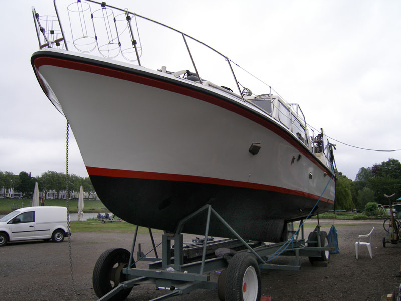 Nach der Winterzeit wurden im Frühjahr des neuen Jahres die Vorbereitungen für eine neue Lackierung des Bootes getroffen. Anschleifen der alten Lackierung. Ausspachtelen der kleineren Beschädigungen am Rumpf. Boot zum Lackieren in die Bootshalle verbringen. Boot lackieren. Neue Gummischeuerleiste anbringen. Vorbereiten zum Slippen.